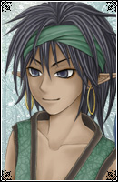 リューサ(本名不明) ダークエルフ 男 ?歳(百歳以上) ルーン大陸の山の麓 漆黒の弓 オレ(なまり交じり) 漆黒の髪と瞳に、褐色の肌を持つ。髪を結い上げ、緑色の布を巻きつけているのが特徴的。 |